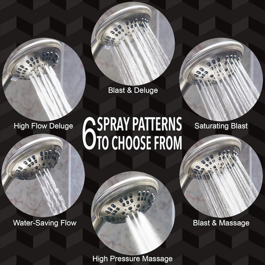 6 Function Luxury Handheld Shower Head - Adjustable Pressure Rainfall Spray with Removable Nozzle, Brushed Nickel